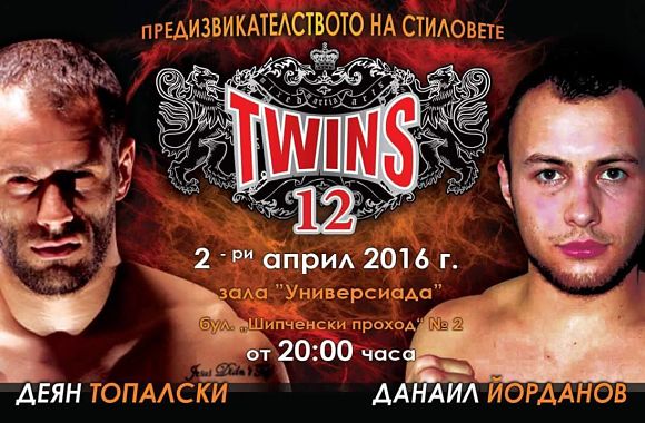 Професионална бойна гала вечер "Предизвикателството на стиловете - TWINS-12" ще се проведе на 2 април 2016г. в София, зала „Универсиада” от 20.00 часа.
