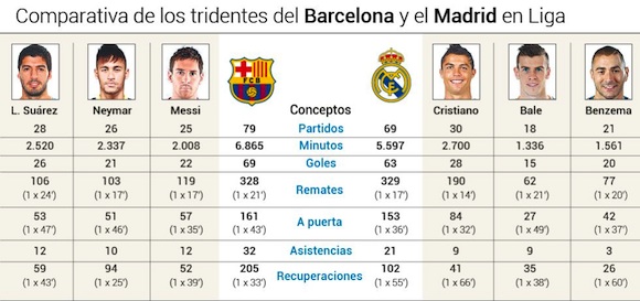 Нека преди това да видим как се справят те досега през сезона. В изминалите 30 кръга на Примера дивисион триото на Барса е нанизало 69 гола - с 6 повече от звездите в бяло. В същото време обаче тризъбецът на Реал Мадрид е по-ефективен, като бележи попадение средно на 89 минути, докато този на каталунците се нуждае от 10 минути повече. Най-ефективен от шестимата е Бензема с голов изстрел на всеки 78 минути. Кристиано пък единствен е бил на терена през всичките 30 мача и то без смяна, анализира AS. Португалецът компенсира за Бейл и французина, които имаха контузии и пропуснаха общо 21 двубоя.