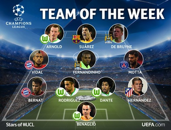Беналио (Волфсбург) - Ернандес (Атлетико Б), Данте (Волфсбург), Родригес (Волфсбург), Бернат (Байерн) - Мота (ПСЖ), Фернандиньо (Манчестър Сити), Видал (Байерн) - Де Бройне (Манчестър Сити), Арнолд (Волфсбург), Суарес (Барселона)