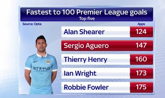 Аржентинският нападател на Манчестър Сити Серхио Агуеро отбеляза във вторник вечерта своя гол №100 в английската Висша лига. Това се случи при равенството 1:1 с Нюкасъл в отложен мач от Премиър Лийг. Попадението на Кун Агуеро бе от засада, но беше зачетено от рефера Кевин Френд. Така или иначе този гол не се оказа достатъчен на "гражданите" за победа, но Агуеро затвърди отличната форма, в която се намира.