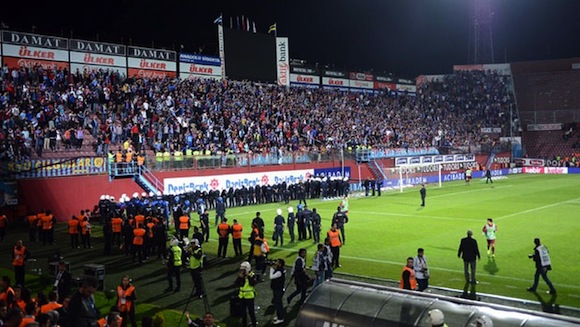 Мачът между Трабзонспор и Фенербахче от 30-ия кръг на турското първенство беше прекратен секунди преди изтичането на допълнителното време. Гостите от Истанбул водеха с 4:0, когато побеснял фен на Трабзонспор нахлу на терена и с юмруци повали единия от страничните съдии. Стюардите веднага реагираха и прекратиха грозната саморазправа, докато от трибуните към терена летяха седалки и всевъзможни предмети. нажежената обстановка принуди главния съдия да нареди на футболистите от двата отбора да се приберат в съблекалните.