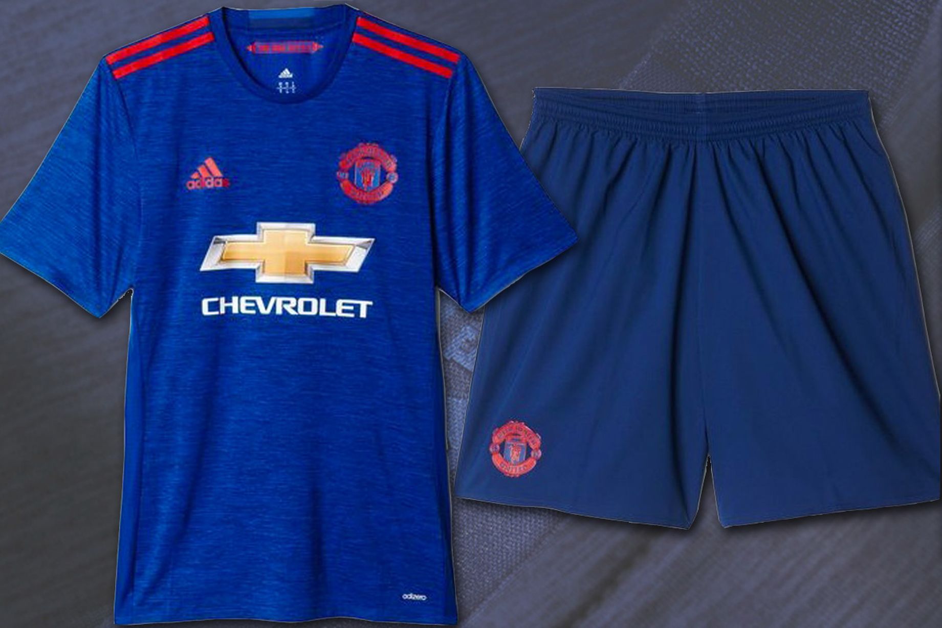 Манчестър Юнайтед представи новия си екип за гостувания за сезон 2016/17. Основният цвят е син, с червени ивици по раменете и ръкавите. Гащетата също са в синьо. Емблемата на основния спонсор Chevrolet остава в добре познатия златист цвят. Вратарският екип е в зелено.