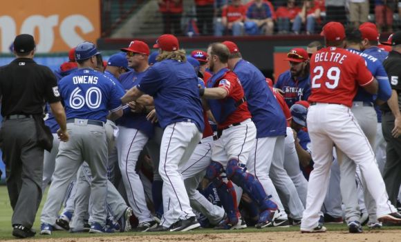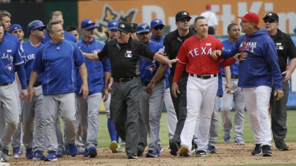 Напрежението между двата тима тлее още от миналия октомври, когато на ст. "Роджърс Сентър" в Торонто звездата на "сините сойки" Хосе Баутиста почти предизвика масово сбиване с невъздържаната си радост при ударен хоумрън. Е, тази сутрин доминиканецът успя да сътвори съвсем истинска битка, в която пое много красиво дясно кроше от втория бейзмен на "рейнджърите" Рунед Одор.