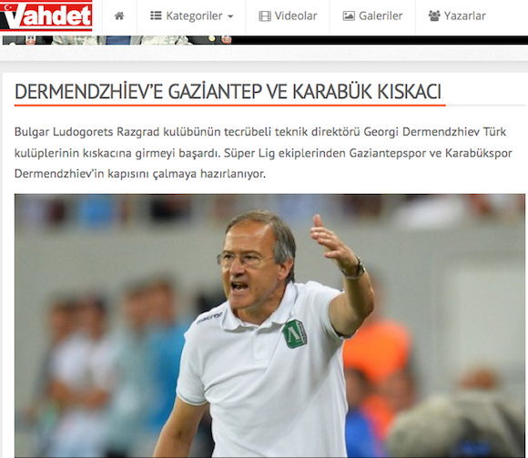Старши треньорът на българския шампион Лудогорец Георги Дерменджиев е попаднал в полезрението на два клуба от елита на Турция, съобщава местният сайт "Вахдет". Според онлайн-изданието опитният специалист, който донесе пета поредна титла на "Лудогорец Арена", е вариант да поеме Газиантепспор или Карабюкспор от следващия сезон.