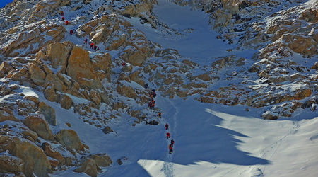Ключовият Френски кулоар минава през скален участък и извежда на върховият гребен. На снимката се виждат поне 26 човека.