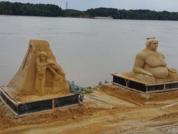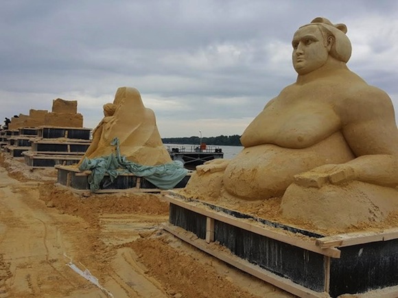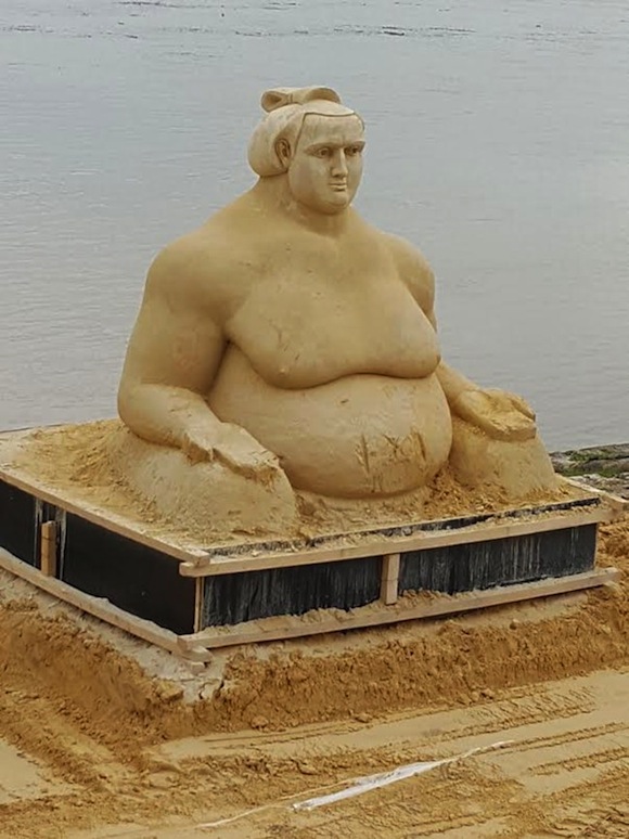 Пясъчна скулптура на известния български сумист Калоян Махлянов – Котоошу вече очаква гости край Дунава на кея на Русе. Огромната фигура е изработена от Руслан Коровков, един от консултантите на започналия от вчера Международен фестивал на пясъчни скулптури Ruse Sand Fest’2016. До нея вече стои и композицията на колежката му от Украйна Ирина Тафлевская, която представлява известен състезател по фигурно пързаляне.