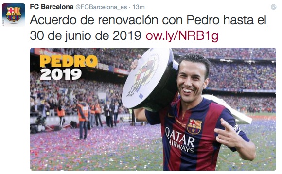 Нападателят на Барселона Педро Родригес е постигнал споразумение за нов договор с каталунския клуб до 2019 година, обявиха официално от "Камп Ноу". Досегашният контракт на канарското крило изтичаше през лятото на 2016 година. Новата клауза за разтрoгване на договора е в размер на 150 милиона евро.