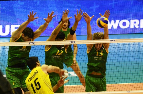 Както в мачовете срещу Италия миналата седмица, австралийците показаха, че са много талантливи, но в крайна сметка успяха да вземат само един гейм от значително по-опитните играчи на "Селесао". "Кенгурата" започнаха равностойно в първия гейм, но постепенно домакините взеха преднина и го спечелеха с 25:20 благодарение на силната игра на Луис Фелипе Фонтелеш - Липе. Гостите от Австралия взеха ранен аванс във втората част, но постепенно бразилците успяха да го стопят и да изравнят при 21:21 с по-добрата си игра в защита и отличните пасове на разпределителя Уилям Аржона. Все пак австралийците затвориха гейма в своя полза при 25:21 след няколко елементарни грешки на опитното либеро Серджо Сантош и резервата Уолъс Де Соуса. Следващите трети и четвърти гейм на мача се развиха по идентичен начин. Домакините от Бразилия повеждаха в началото на частите благодарие на атаките на Евандро Гера и капитана Мурило Ендрес и впоследствие ги спечелиха с убедителното 25:19 и 25:18, а с това и мача с 3:1.