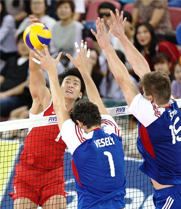 Над всички за чешкия тим отново бе Ян Щокър с 25 точки (2 блока и 51% ефективност в атака), а Камил Баранек добави още 21 точки (2 блока, 2 аса и 77% ефективност в атака) за победата. За корейците Мюн-Гюн Сон реализира скромните за пет гейма 16 точки (2 блока, 1 ас и 42% ефективност в атака), което бе недостатъчно за успеха.