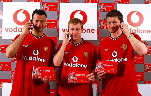 Ливърпул отново бе пионер през 1992 година, когато подписа договор с Carlsberg до 2010 година - най-дългосрочният в британския футбол. През тези години обаче отборът, който доминира е Манчестър Юнайтед, а на неговите екипи стои логото на Sharp. Компанията за електроника спонсорира "червените дяволи" в периода 1983 - 2000 година, като първоначално сделката е за 500 хил. паунда за две години. Постепенно обаче и на "Олд Трафорд" се насочват към големите пари и през 2000 година клубът се обвързва с Vodafone срещу 30 милиона паунда.
