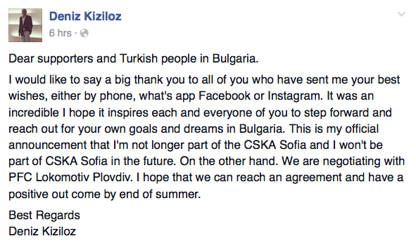 Искам да кажа едно голямо благодаря на всички, които ме подкрепиха, като ми изпратиха съобщения по телефона, Фейсбук или Инстаграм. Беше невероятно. Надявам се да успеем да се вдъхновим един друг и да успеем да постигнем целите и мечтите си в България. Това е моето официално съобщение, че аз не съм част от ЦСКА и няма да бъда. От друга страна, се намираме в преговори с Локомотив (Пловдив). Надявам се да успеем да постигнем съгласие и всичко да има положителен изход в края на лятото", написа Кизилоз.