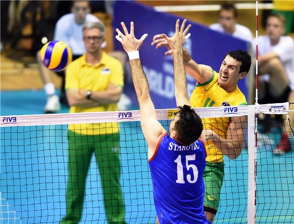 Двата тима тръгнаха равностойно до средата на първия гейм, след което сърбите дръпнаха с 16:12 след няколко страхотни блока на Сречко Лисинац. Австралия, обаче, не се предаде и успя да изравни при 19:19. В заключителните минути на гейма домакините се оказаха по-хладнокръвни и го взеха след 25:23. "Плавите" започнаха концентрирано втората част и поведоха с 8:6. Австралийците изравниха при 12:12, но след това имаше само един отбор на полето - 25:20 и 2:0 за Сърбия. Момчетата на Никола Гърбич продължиха с доброто си представяне и в третия гейм като първо поведоха с 13:8, а след това го спечелиха с 25:20 и мача с 3:0.
