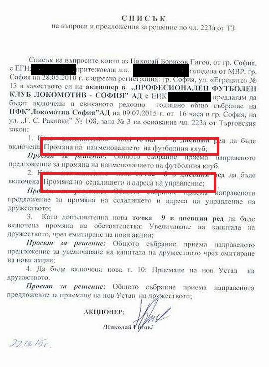 Сагата около бъдещето на ЦСКА продължава и днес. Колегите от БЛИЦ днес публикуваха документ, от който става ясно, че Николай Гигов има намерение да направи съществени промени. Президентът на Локомотив (София) в качеството си на акционер е отправил предложения за преименуване на клуба, промяна на седалището и адреса на управление и увеличаване на капитала. Документът е с дата 22 юни (вчера). Предложенията на Николай Гигов са приети и ще бъдат гласувани на Общото събрание на Локомотив на 9 юли.
