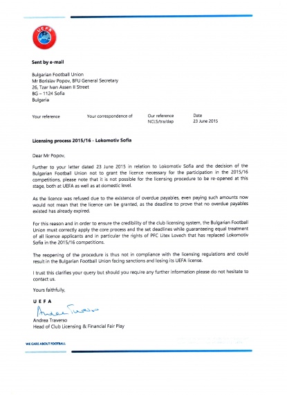 С официално писмо до изпълнителния директор на Българския футболен съюз Борислав Попов УЕФА категорично изрази позицията си относно възможността отнетият от "Локомотив" (Сф) лиценз за европейските клубни турнири и професионалния футбол да бъде възстановен. "Лицензионната процедура и правилата категорично не допускат ново отваряне на процеса. "Локомотив" е с отнет лиценз и неговото възстановяване, дори и при извършени плащания по задълженията след установения срок, ще бъде сериозно нарушение, което може да доведе до дисциплинарни наказания и дори до отнемане на европейския лиценз на българската федерация", се казва в писмото, подписано от Андреа Траверсо – шеф на отдел "Лицензиране и Финансов феърплей" към европейската футболна централа.