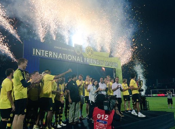 Отборът на Борусия (Дортмунд) записа втора победа по време на азиатското си турне след категорично 6:1 над малайзийския шампион Джохор Саутърн Тайгърс. Илкай Гюндоган (22), Пиер-Емерик Обамеянг (29), Кевин Кампъл (32), Шинджи Кагава (74), Жереми Дудзяк (82) и Марко Ройс (90) реализираха за вестфалския тим. Във вторник дортмундци също отбелязаха шест попадения, но безответни, на японския Кавазаки.