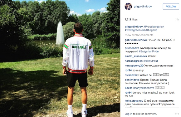 Малко след като се присъедини към съотборниците си Григор Димитров облече националния екип и заля социалните мрежи с патриотични послания. Той публикува в "Инстаграм" своя снимка, на която е в гръб, за да се вижда ясно надписът "България". #ГордБългарин #бялозеленочервено #България", гласят хаштаговете, придружаващи кадъра.