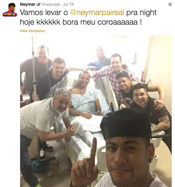 Бразилският нападател на Барселона Неймар пусна поредна снимка в своя профил в Instagram. Номер 11 на каталунския тим се опита да повдигна духа на баща си с весела снимка от болничното заведение, в което лежи таткото. Възрастният родител е в клиника след операция на коляното. Ето я и снимката, публикувана в социалната мрежа.