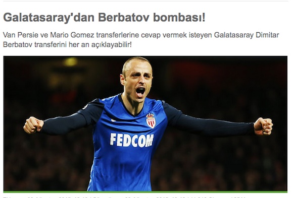 Димитър Бербатов е отговорът на Галатасарай в битката с големите съперници Фенербахче и Бешикташ, които това лято вече се подсилиха с класни нападатели в лицето на Робин ван Перси и Марио Гомес. Според сайта "haber7" българският футболист, който е свободен агент, е получил предложение да подпише с Чим Бом за една + една година при заплата от 3 млн. евро. Изданието твърди, че същата сума дава и Астън Вила, макар медиите в Англия да пишат за 3,5 млн. евро. Големият коз на Галатасарай е предстоящото участие в Шампионската лига.