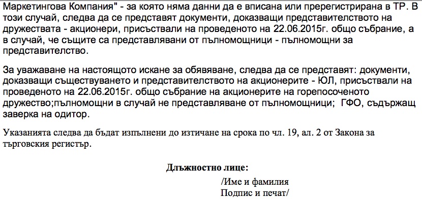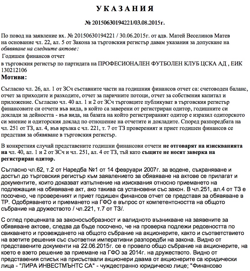 От търговския регистър уведомяват при какви условия ще удоволетворят искането за обявяване. ЦСКА трябва да представи: документи, доказващи съществуването и представителството на акционерите, присъствали на проведеното на 22 юни 2015 г. общо събрание на акционерите; ГФО, съдържащ заверка на одитор.