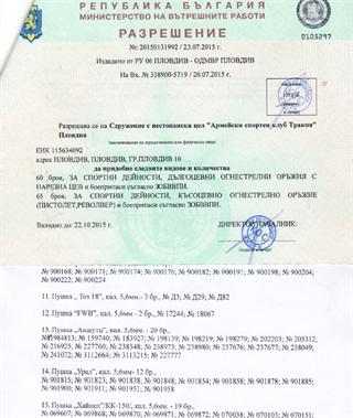 Страница от разрешението с пълен опис на номерата на оръжията, които могат да бъдат прехвърлени от активите на федерацията към тези на "АСК Тракия".