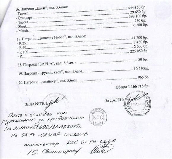 От описа за прехвърлянето на собствеността се вижда, че и под дарител, и под дарен стои подписът на Шишманов. Нещо, за което няма никаква правна пречка. Което пък говори за празнота в законовата уредба, позволяваща спортно дружество с отнет от държавата лиценз да продължава да се разпорежда по свое усмотрение (и без никакъв контрол) с благата, придобити отново със средства от държавата. Разрешението за придобиване на 60 пушки и 65 пистолета плюс боеприпаси и допълнението, че на 29 юли са прехвърлени чрез дарение 56 пушки и 63 пистолета.