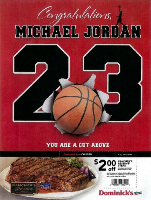 Цената на името на Джордан е в основата на решението, което съдебните заседатели трябва да вземат за това колко трябва да плати заведението Dominick's Finer Foods за пусната през 2009 г. в сп. Sports Illustrated реклама, с която поздравява баскетболиста за приемането му в Залата на славата. Рекламата също така включвала купон за изрязване с 2 долара отстъпка за поръчана пържола в заведението.