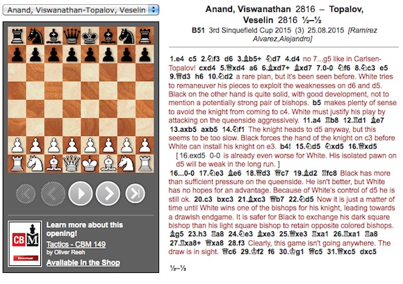 Така Топалов остава лидер в класирането с 2,5 точки. Русенецът стартира в турнира с успех срещу настоящия №1 Магнус Карлсен, след което се наложи и над представителя на домакините Хикару Накамура. В четвърти кръг Топалов ще играе с руснака Александър Гришчук, който ще бъде с белите фигури.