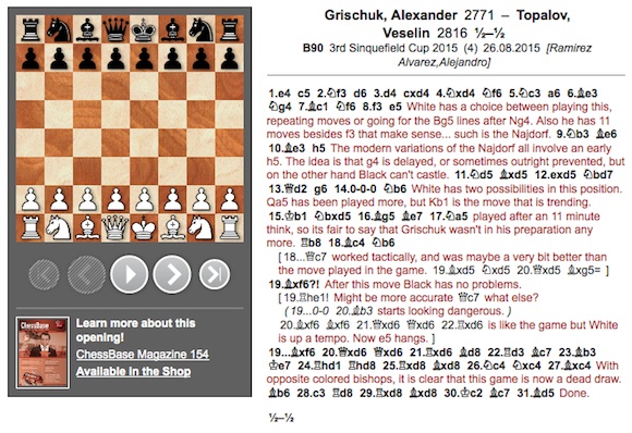 Българинът отново избра Сицилианската защита, по подобие на срещите с Магнус Карлсен и Вишванатан Ананд. Двамата гросмайстори изиграха равностойна партия и се съгласиха на равенството на 31-ия ход.