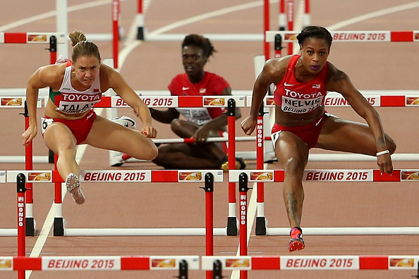 Олимпийската шампионка от Пекин 2008 на 100 метра с препятствия и втора от Игрите в Лондон през 2012 г. Доун Харпър-Нелсън (САЩ) не успя да се класира за финала на Световното първенство по лека атлетика в Пекин. Американката се спъна още във второто препятствие в първата полуфинална серия и не успя да завърши бягането си. Още една представителка на САЩ се провали в полуфиналите. Кендра Харисън беше дисквалифицирана във втория полуфинал, след като направи фалстарт.