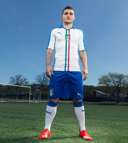 Националният отбор на Италия представи новия си екип за гостувания, с който ще играе в утрешния мач срещу Малта. Съперникът на България в европейските квалификации има договор с германския концерн "Пума. Като резервен екип той ще използва бели фланелки и сини гащета, като на фланелките ще има три вертикални ивици в цветовете на италианското знаме, а на ръкавите ще има сини ивици, като яката също ще бъде в синьо.