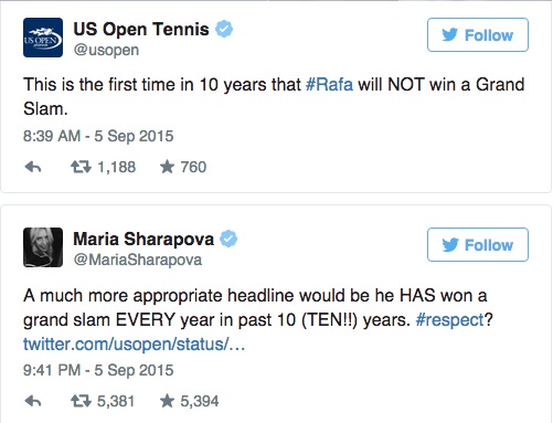 Световната номер 3 Мария Шарапова влезе в ролята на защитник на Рафаел Надал. Причината бе съобщение, публукувано в официалния Twitter на US Open след отпадането на испанеца от Откритото първенство на САЩ в Ню Йорк. Припомняме, че Рафа загуби в пет сета срещу Фабио Фонини от Италия.