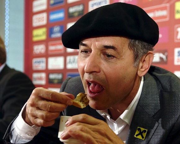 Селекционерът на Австрия Марсел Колер изуми всички по време на пресконференцията след двубоя с Швеция в Стокхолм във вторник вечер. Неговият отбор спечели с 4:1 и се класира за Евро 2016 във Франция. Радостта от това накара специалиста да се яви на срещата с медиите с кепе на главата и багета в ръката, олицетворявайки френската традиция. Докато отговаряше на въпросите, Колер си топеше хлебчето в супа и сладко-сладко похапваше.