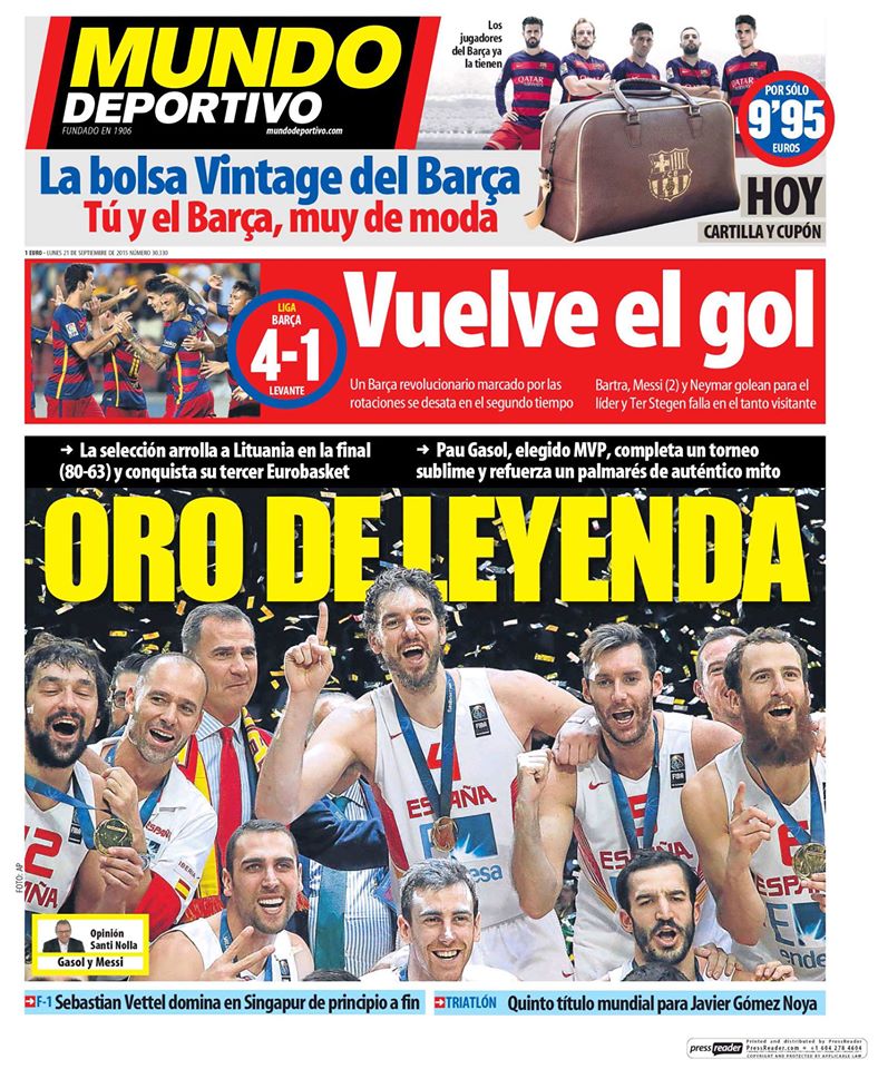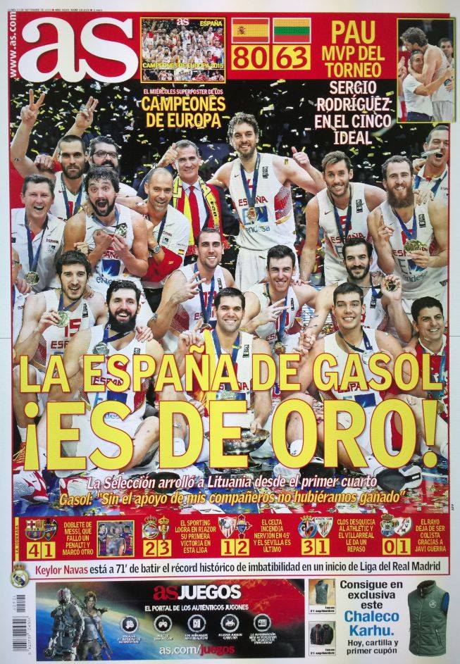 Европейското злато на баскетболния тим на Испания е водеща новина в испанската преса днес. "Вечни", пише най-четеният ежедневник в страната "Марка", поставяйки голяма снимка на героя Пау Гасол. "Испания на Гасол е златна", грее с жълти букви от първа страница на "АС". "Легендарно злато", е избраното голямо заглавие от каталунския "Мундо Депортиво".