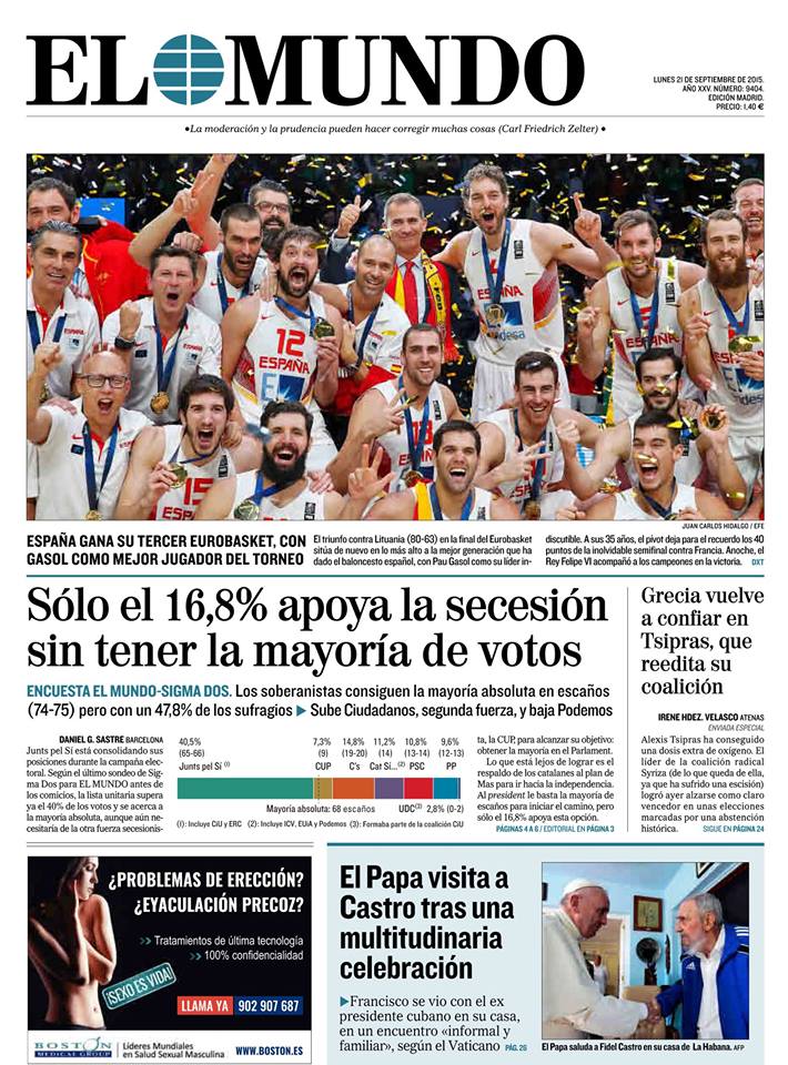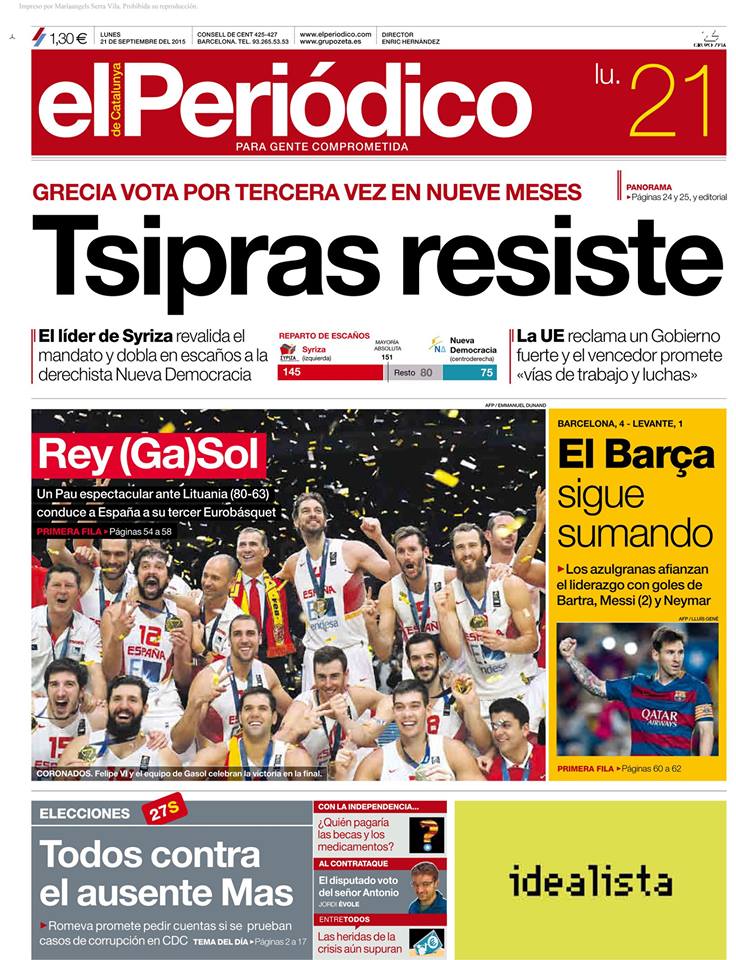 "Шампиони!", простичко, но достатъчно гордо пише и барселонският "Спорт". Политическите всекидневници също поставят успеха на иберийския тим на първите си страници заедно с победата на Ципрас на изборите в Гърция. "Трето европейско злато за един легендарен отбор", пише "Ел Паис". "Испания спечели третото си злато, а Гасол стана MVP на турнира", гласи заглавието на "Ел Мундо". "Ел Периодико" и "Ла Вангуардия" също отделят сериозно внимание на триумфа.