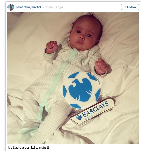 Звездната покупка на Манчестър Юнайтед Антони Мартиал заслужи първото си отличие "Играч на мача" след двата си гола във вратата на Саутхамптън снощи, помогнали за успеха с 3:2 над "светците". 19-годишният стрелец пусна снимка в Instagram заедно с наградата и своята малка дъщеричка.
