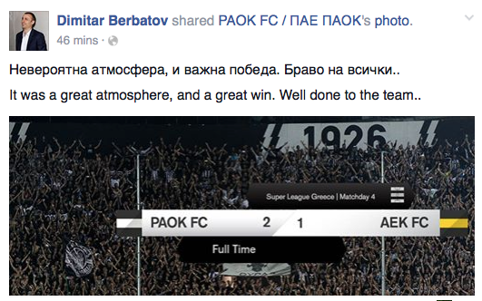 "Невероятна атмосфера, и важна победа. Браво на всички", написа Бербатов във "Фейсбук", добавяйки снимка от препълнените трибуни на стадиона.