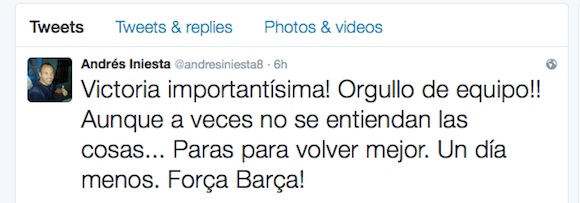 Капитанът на Барселона Андрес Иниеста публикува обръщение към своите фенове, след като снощи получи мускулна травма на дясното бедро по време на мача с Байер (Леверкузен) в Шампионската лига. Халфът е с разтежение, като все още няма официална информация колко дълго ще продължи възстановяването му, но се очаква то да е между 4 и 6 седмици. "Ще се завърна по-силен. Остава един ден по-малко. Успех, Барса!", написа Иниеста в профилите си в социалните мрежи.