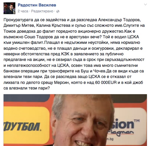 Да се види къде са влезнали тези пари. Да се разследва защо ЦСКА се е отказал от лихвата по делото срещу Мерсин, която е над 60 000 EUR и в кой джоб са влезнали тези пари?", пише Василев на своята страница във "Фейсбук".