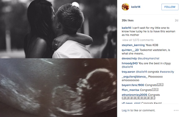 Закупеният от Волфсбург за рекордните 80 млн. евро ас на Манчестър Сити Кевин де Бройне се похвали със снимка от ултразвук в Инстаграм, че с приятелката му Мишел ще стават родители за първи път.