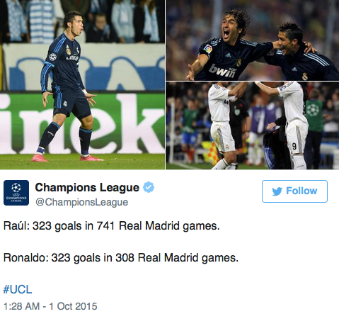 Според испанския вестник "Марка" обаче, както и на официалния сайт на Реал, головете на португалеца са 324. Разликата идва от "споделен" с Пепе гол във вратата на Реал Сосиедад. На 18 септември 2010 г. "лос бланкос" печелят с 2:1, а победното попадение идва след шут от пряк свободен удар на Роналдо и рикошет в гърба на неговия сънародник. За статистиката обаче Пепе е записан като автор на гола, което означава, че CR7 ще дели върха с Раул поне още няколко дни, преди да го завземе еднолично.