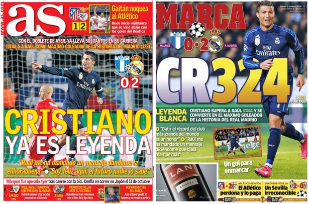 Снощи Кристиано Роналдо отбеляза и двата гола за победата на Реал Мадрид с 2:0 над Малмьо в среща от група "А" на Шампионската лига. По този начин той вече има 501 гола в своята кариера, а 323 от тях са с фланелката на 10-кратния шампион на Европа. Със снощните попадения CR7 изравни легендата на тима Раул като голмайстор №1 за всички времена.