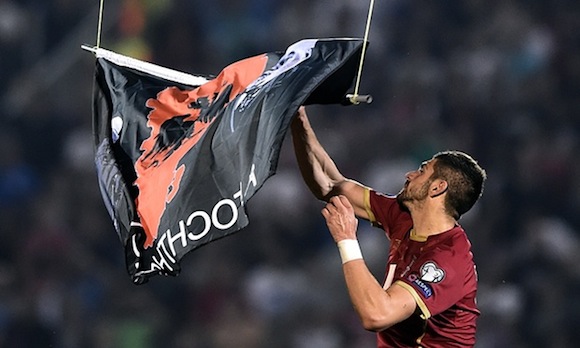 Вестник "Блиц" съобщава още, че албанците готвят нова провокация с песен, в която величаят Армията за освобождение на Косово. "Това е мястото, където съм роден, където е гнездото на орлите, ние сме АОК, напред Албания", са думи от песента, с която сръбските футболисти ще бъдат провокирани от трибуните в Елбасан. Подготвено е и огромно албанско знаме, пише "Блиц".