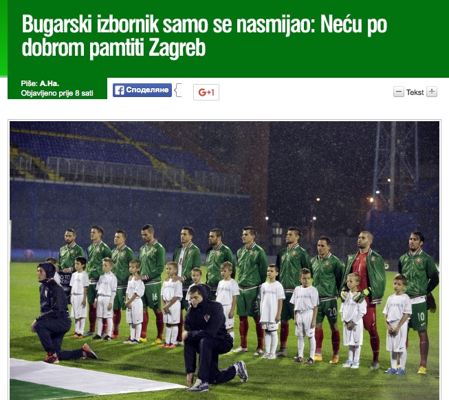 Днешната хърватска преса коментира в безброй материали снощния квалификационен мач за европейско първенство по футбол между Хърватия и България, в който домакините победиха с 3:0 на стадиона в Максимир, който бе без зрители заради наказание на Хърватския футболен съюз. Известният хърватски спортен журналист Томислав Жидак в голям материал под заглавие "Хърватия най-после игра като голяма футболна сила. Но българите си нямаха хабер", пише: "Тъкмо зазвъняха първите тактове на максимирския "танц в дъжда" и България вече бе на колене. Една топка на Лука Модрич "под земята" изведе Иван Перишич и той рутинно вкара. След непълни 100 секунди мачът бе решен... Хърватия пропусна още в първите двадесет минути да нокаутира България. Депресивна атмосфера, досаден дъжд и мач без значение за тях вероятно доуби мотивацията на българите, които в средата на първото полувреме опитаха сами да се довършат. Георги Терзиев от отчаяние стреля в собствената врата, но уцели "само гредата". Още се тресе..."