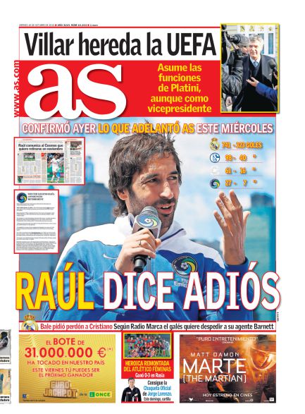 "Раул каза "сбогом", е голямото заглавие на "АС". "Потвърди вчера това, което "АС" написа в сряда", се казва още на първата страница на вестника. Ел Сиете приключва кариерата си с цели 17 клубни трофея, сред които 3 Шампионски лиги и 6 титли в Примера дивисион. Раул остави дълбок и неизличим отпечатък на "Сантиаго Бернабеу" със своите 323 гола, които са връх в постижението, на което вече стъпи и Кристиано Роналдо.