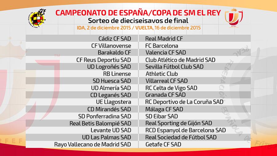 На фаза 1/16-финал настоящият носител на трофея Барса излиза срещу Вийяновенсе от област Екстремадура. През миналия сезон скромният тим завърши на четвърто място в група 4 на Сегунда "Б". Реал Мадрид има за съперник друг третодивизионен тим - андалуският Кадис, който през миналия сезон спечели същата група 4 на Сегунда "Б", но не успя да се класира за Сегунда. Схватките са в два мача, като в първия тимът от по-долна дивизия е домакин.