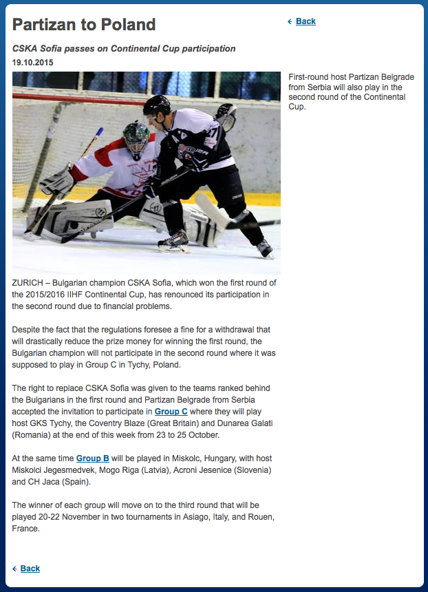 Новината бе потвърдена официално на сайта на международната хокейна федерация (IIHF). Мястото на ЦСКА във втората фаза на турнира ще бъде заето от сръбския Партизан.