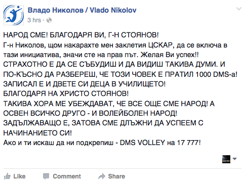 Страхотно е да се събудиш и да видиш такива думи и по-късно да разбереш, че този човек е пратил 1000 dms-а! Записал е и двете си деца в училището. Благодаря на Христо Стоянов. Такива хора ме убеждават, че все още сме народ! А освен всичко друго - и волейболен народ. Задължаващо е, затова сме длъжни да успеем с начинанието си!