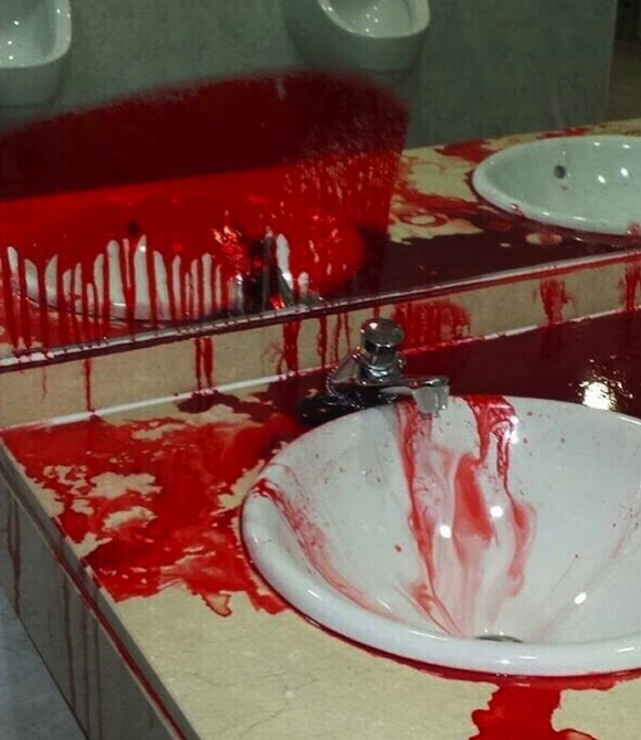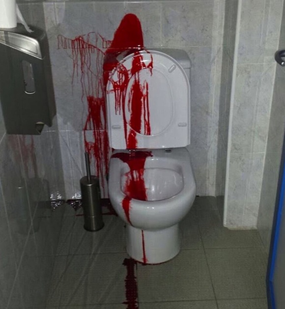 От фотосите се вижда какви поразии са нанесли каталунците в стремежа си да изглеждат забавни. С боя са заляти тоалетните чинии и мивките.