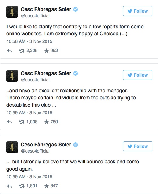 Халфът на Челси Сеск Фабрегас побърза да отрече, че се опитва да дискредитира мениджъра си Жозе Моуриньо. През уикенда авторитетната "Би Би Си" информира, че един от футболистите на шампионите е заявил, че по-скоро би губил мачове, отколкото да печели, за да може Специалния да запази поста си. Снощи пък из социалните мрежи плъзна слух, че Фабрегас е начело на бунта в съблекалнята.