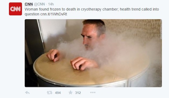 Туийтът, който набързо беше изтрит, гласеше: "Жена е била намерена замръзнала в камера по време на криотерапия, смисълът на терапията е поставен под въпрос".